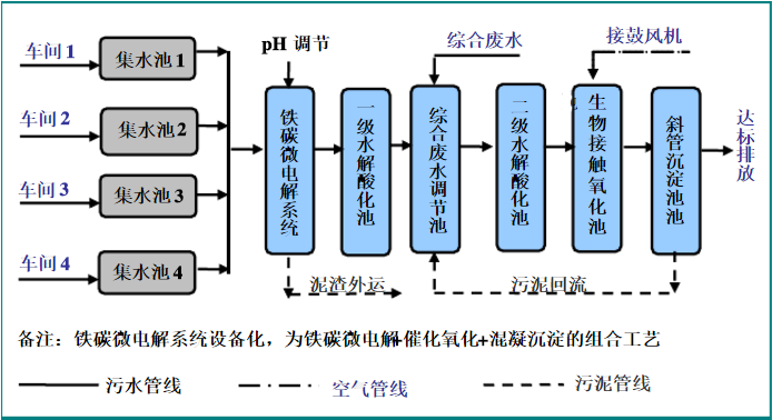 各類生產(chǎn)線的廢水進(jìn)行單獨(dú)收集,之后統(tǒng)一送入初調(diào)節(jié)池中進(jìn)行水質(zhì)的調(diào)節(jié),;預(yù)處理采用“鐵碳微電解+催化氧化+混凝沉淀”工藝,沉淀溢流到一級水解酸化池中,之后流入到綜合調(diào)節(jié)池中,與生活污水、清潔下水混合后,送入二級水解酸化池,水解后出水至生物接觸氧化池中進(jìn)行好氧處理,處理后水進(jìn)入沉淀池中,上清液排放。